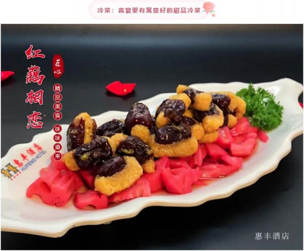 紅棗象征著早生貴子,可以做成甜品,蓮藕為多子多福,藕斷絲連的寓意,皆象征著美好,糯米將其黏在一起,則寓為永結(jié)同心、甜甜蜜蜜之意。