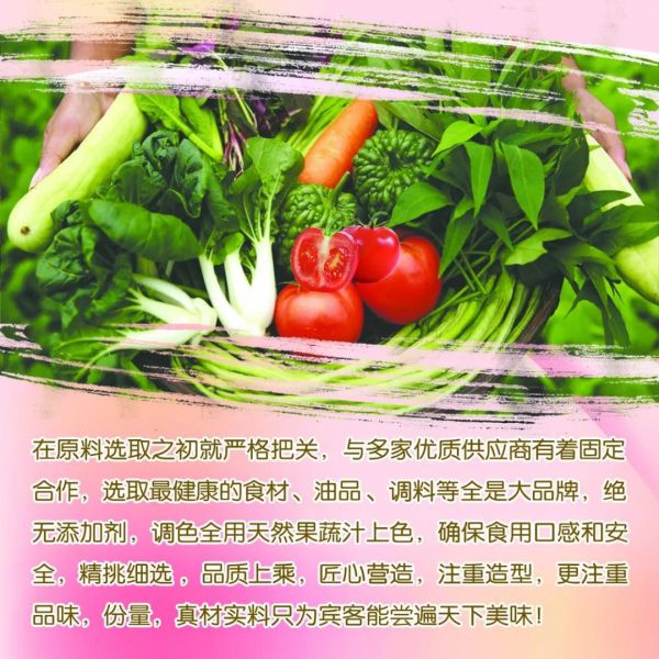 我們建立了3000平方米的中央廚房,5S管理,衛(wèi)生,整潔,食材、原料、果蔬全部原產(chǎn)地直供大規(guī)模采購(gòu),所有的調(diào)味品,食用油等全部是大品牌,絕無添加劑,調(diào)色全用天然果蔬汁上色,確保食用口感和安全。宴會(huì)出品推陳出新,保留經(jīng)典傳統(tǒng)宴會(huì)菜品,創(chuàng)新菜品樣式,確保絕佳口味。